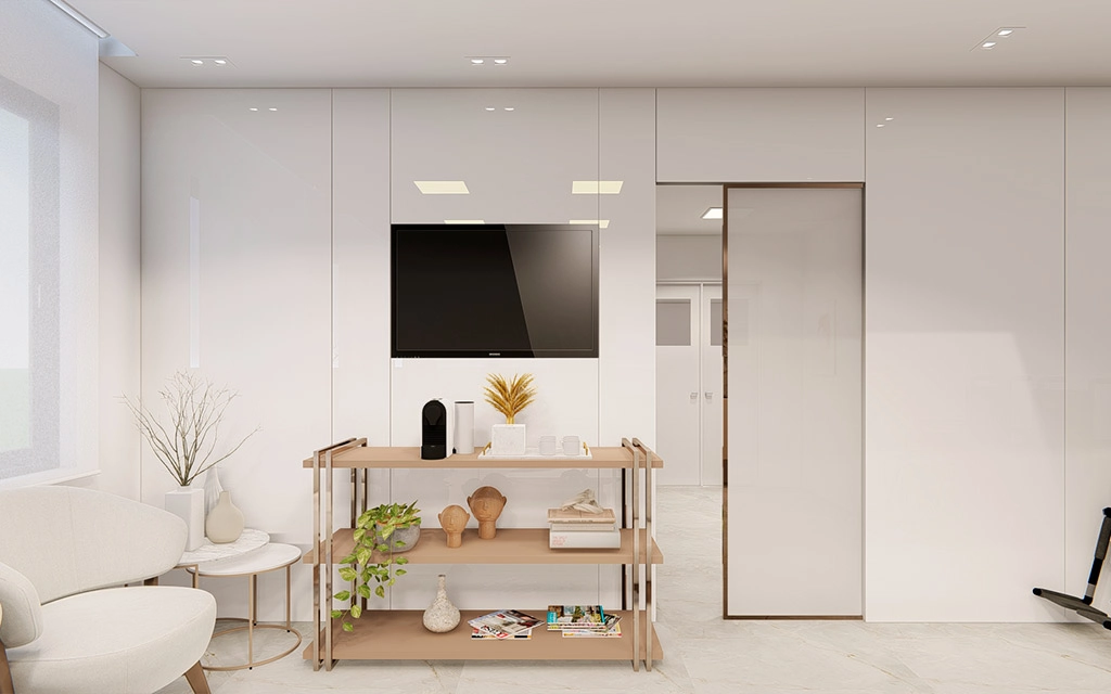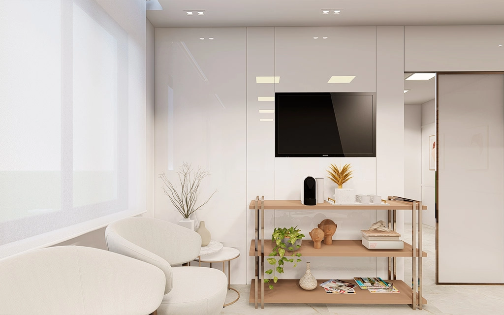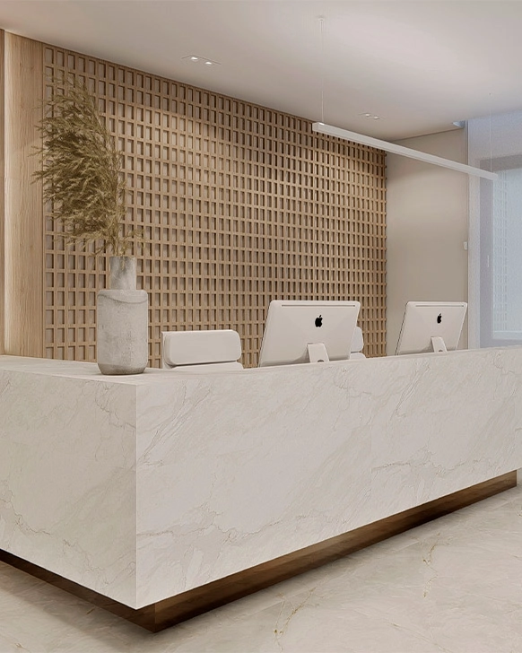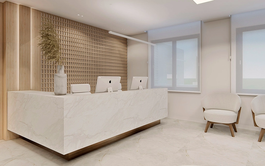 O balcão de atendimento combina o marmorizado claro com uma estrutura metálica dourada, resultando em uma composição que equilibra sofisticação e calor humano. A paleta de tons neutros e claros foi escolhida cuidadosamente para suavizar a experiência no ambiente clínico, reduzindo o aspecto hospitalar e criando uma atmosfera mais tranquila e humanizada.
