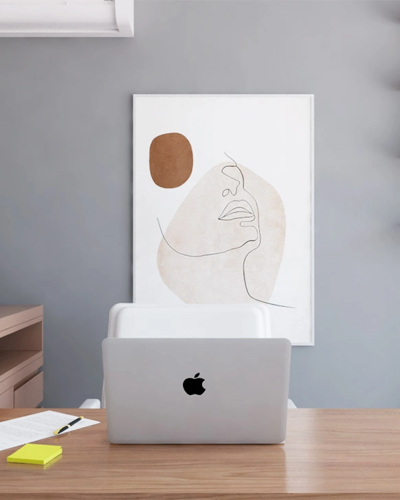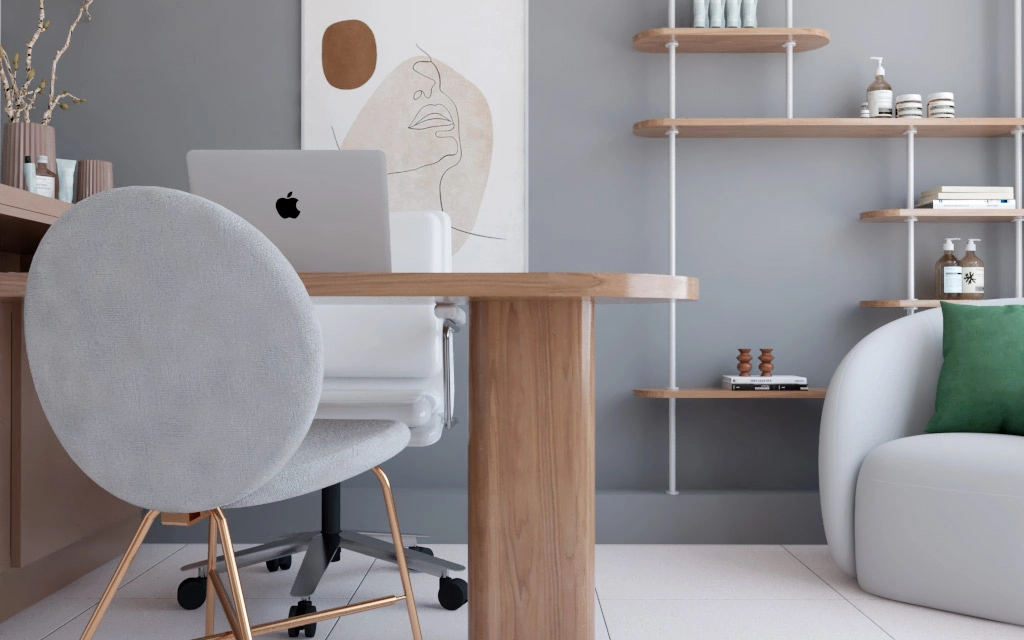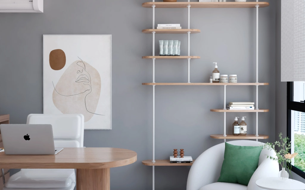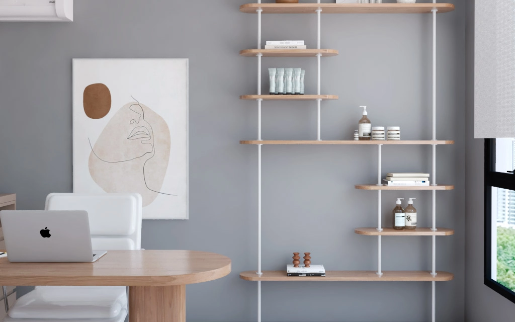 Criamos um espaço sutil e funcional para a exposição de amostras de produtos, com prateleiras amadeiradas de cantos arredondados e estrutura tubular branca, atendendo a uma necessidade prática da cliente. Esse canto de amostras trouxe ao espaço uma sensação de suavidade e harmonia. A composição transmite delicadeza, sem sobrecarregar visualmente o ambiente.