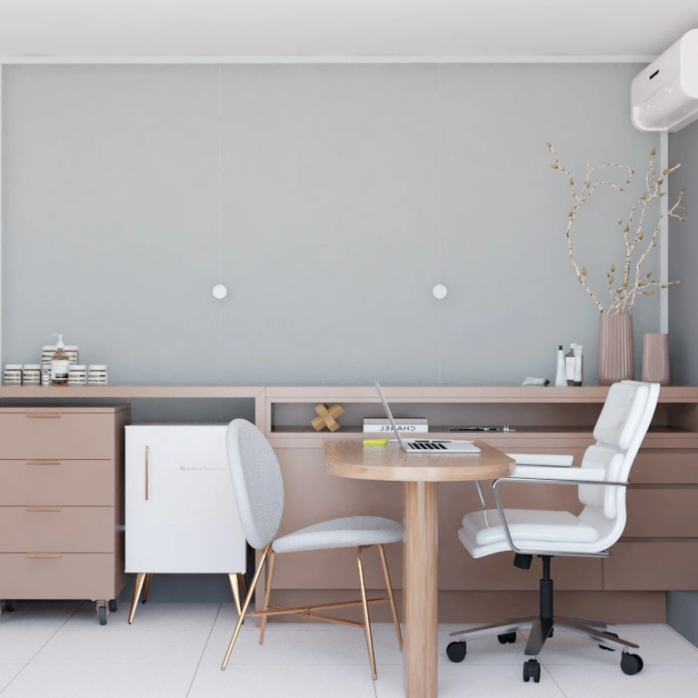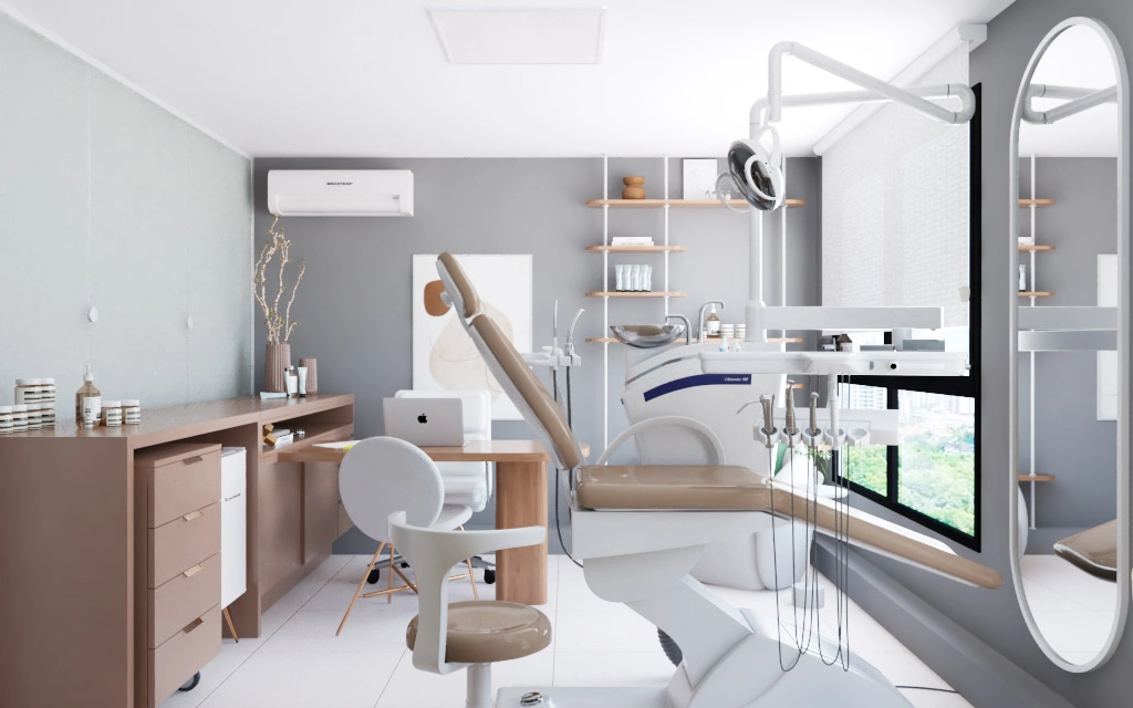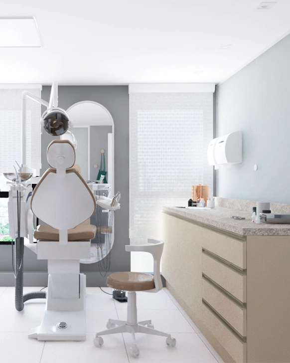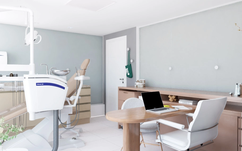 Nosso desafio foi transformar uma sala compacta em um consultório funcional, acolhedor e visualmente leve. A principal demanda da cliente era conciliar, no mesmo ambiente, a cadeira odontológica de atendimento e uma mesa de trabalho com poltrona — sem comprometer a circulação ou o conforto.