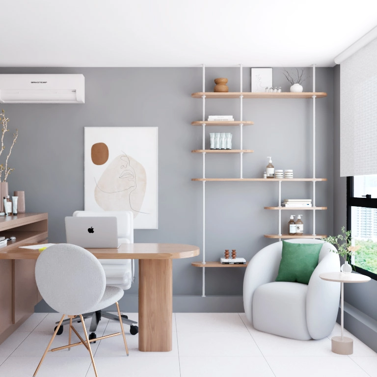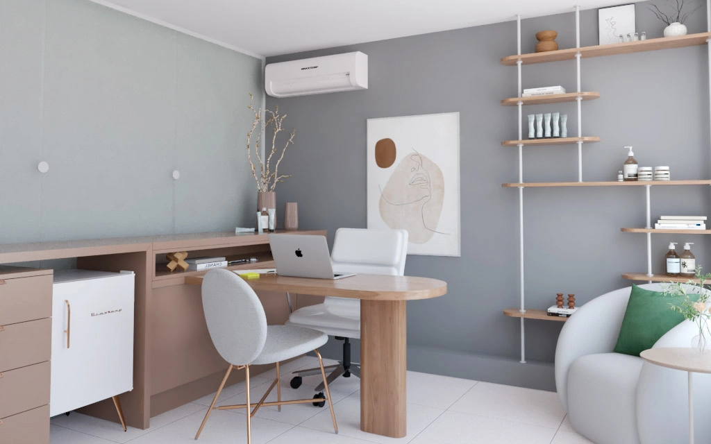 Cada elemento foi pensado para somar, sem excessos — criando um ambiente que traduz profissionalismo, conforto e sofisticação, mesmo em uma metragem reduzida.