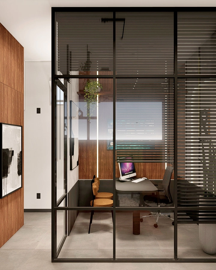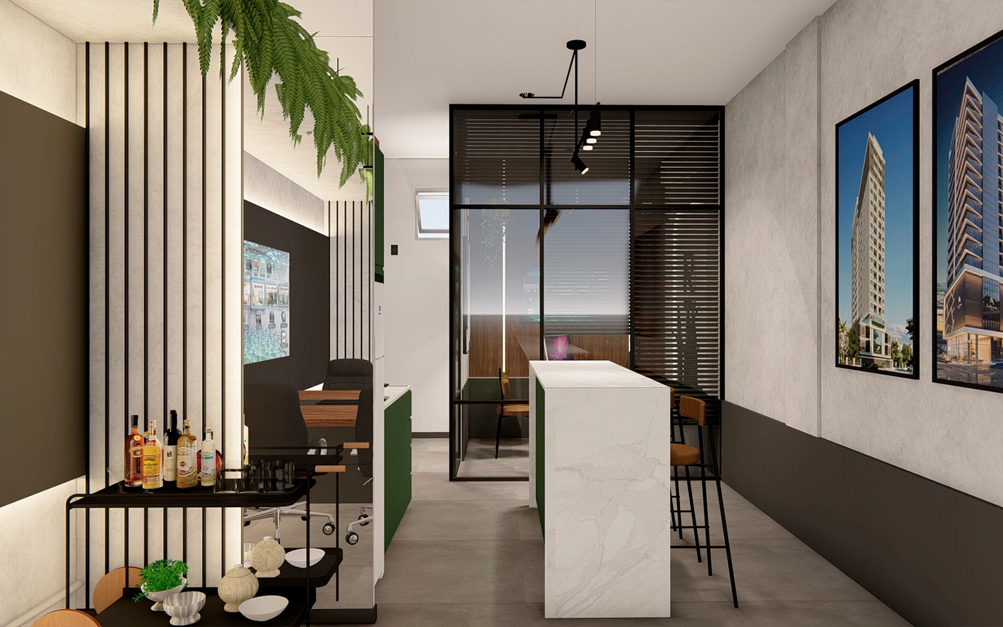 O desafio proposto para este projeto foi transformar um espaço de 55m² em um ambiente funcional e confortável, e que atendesse a um amplo programa de necessidades. O espaço deveria acomodar uma recepção, área para 6 a 8 corretores trabalhando de forma colaborativa, uma cozinha integrada e uma sala do diretor fechada, permitindo reuniões com maior privacidade.