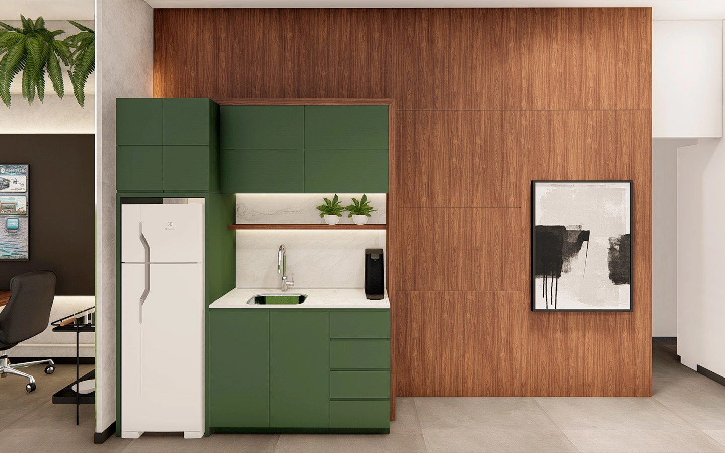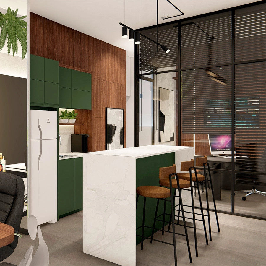 A paleta de cores e materiais foi cuidadosamente escolhida para refletir a essência do cliente. Tons amadeirados escuros e móveis em cinza escuro foram utilizados para transmitir uma atmosfera sóbria e masculina, alinhada ao perfil do cliente. Para suavizar a rigidez do ambiente, a cozinha foi projetada em tom verde e pedra branca, oferecendo um contraste delicado e trazendo um toque de frescor e leveza ao conjunto.