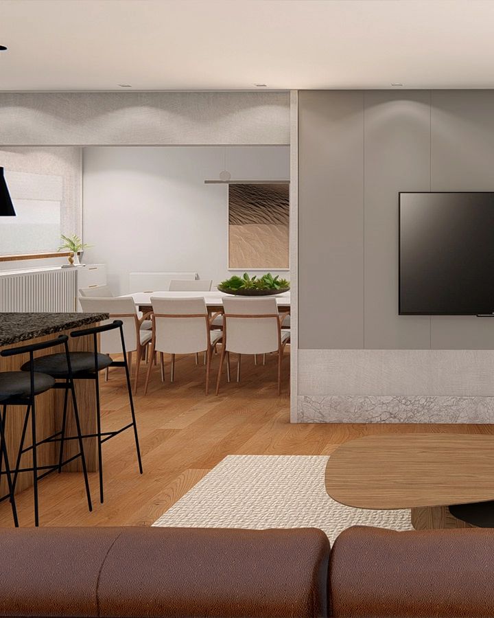 Cada tom de acabamento foi cuidadosamente escolhido para criar uma atmosfera acolhedora e sofisticada, que se mistura naturalmente com o restante da decoração já existente na casa. O painel de TV foi uma escolha estratégica. Sem a necessidade de um hack, garantimos que a área de estar se mantenha ampla e fluida.