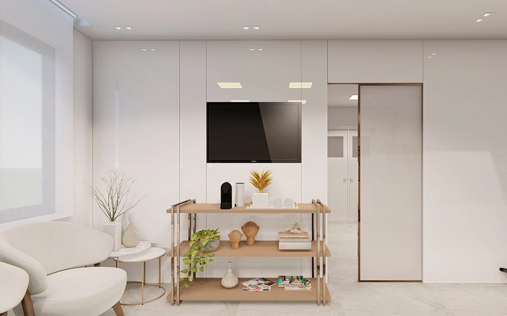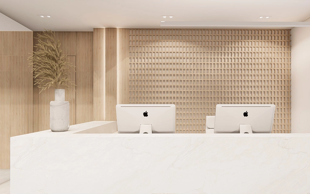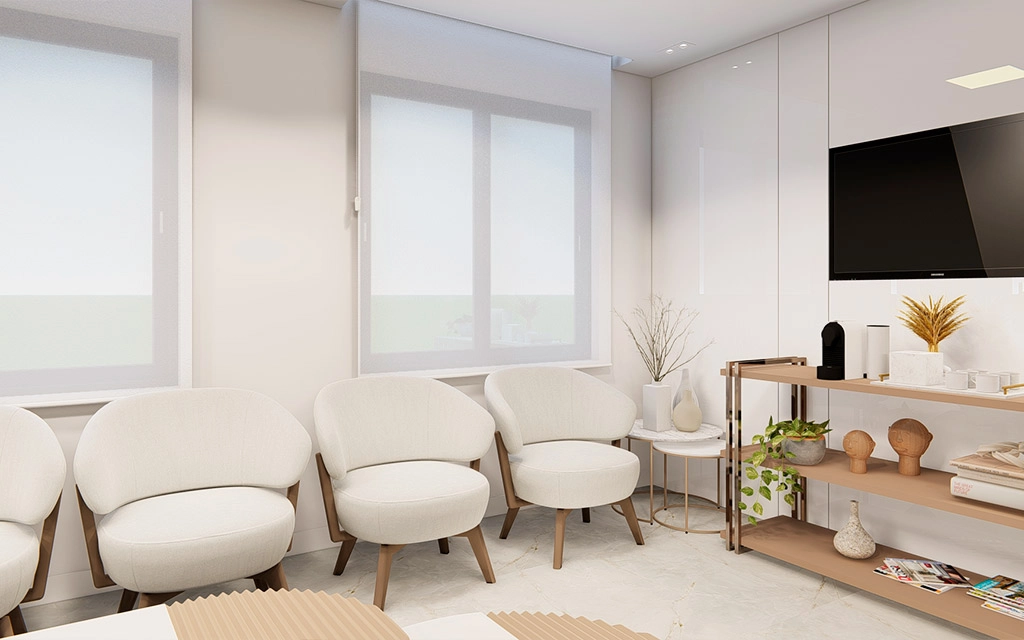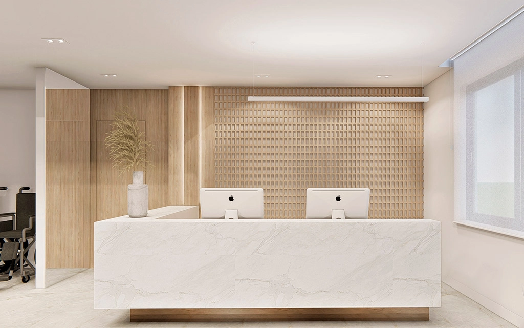 O balcão de atendimento combina o marmorizado claro com uma estrutura metálica dourada, resultando em uma composição que equilibra sofisticação e calor humano. A paleta de tons neutros e claros foi escolhida cuidadosamente para suavizar a experiência no ambiente clínico, reduzindo o aspecto hospitalar e criando uma atmosfera mais tranquila e humanizada.