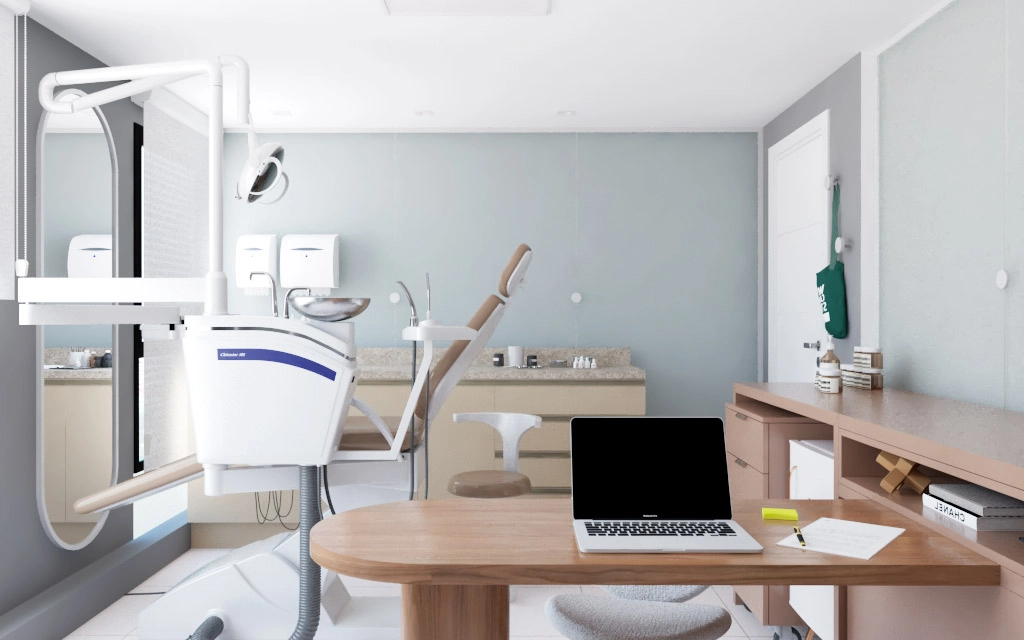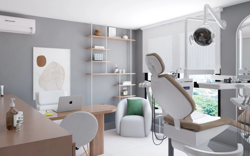 Nosso desafio foi transformar uma sala compacta em um consultório funcional, acolhedor e visualmente leve. A principal demanda da cliente era conciliar, no mesmo ambiente, a cadeira odontológica de atendimento e uma mesa de trabalho com poltrona — sem comprometer a circulação ou o conforto.