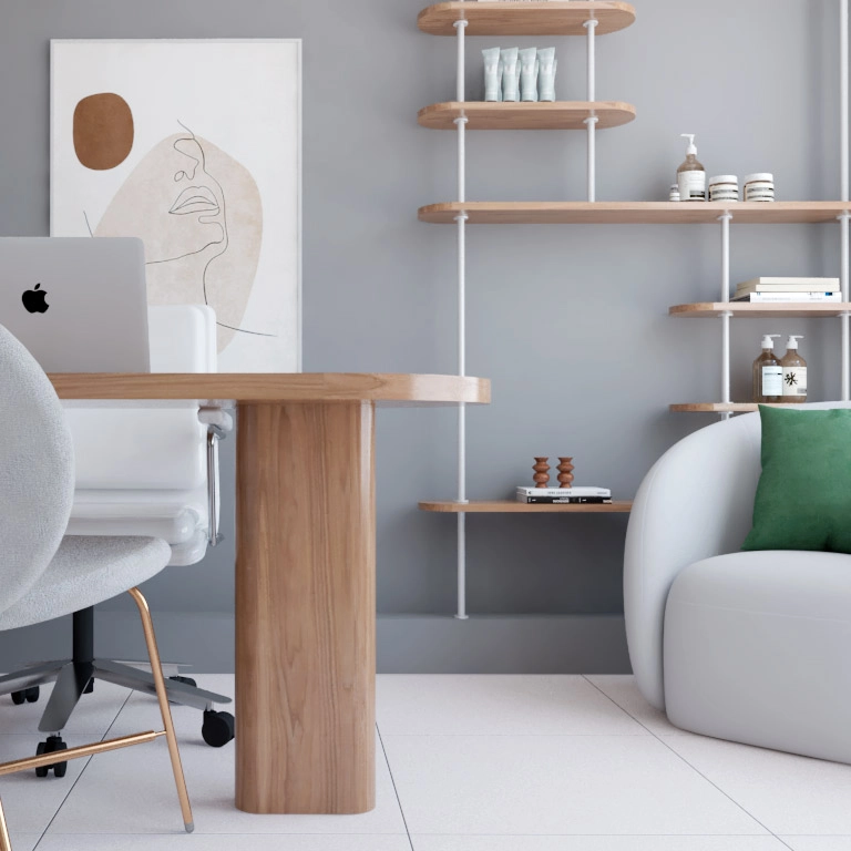 Criamos um espaço sutil e funcional para a exposição de amostras de produtos, com prateleiras amadeiradas de cantos arredondados e estrutura tubular branca, atendendo a uma necessidade prática da cliente. Esse canto de amostras trouxe ao espaço uma sensação de suavidade e harmonia. A composição transmite delicadeza, sem sobrecarregar visualmente o ambiente.
