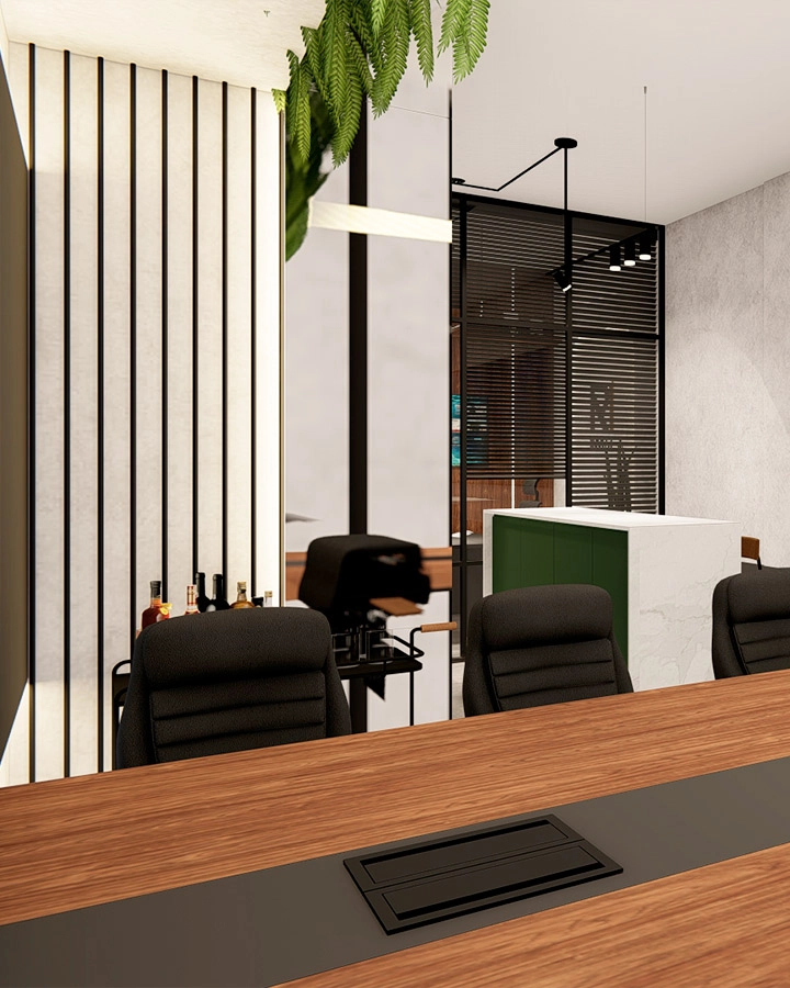 O desafio proposto para este projeto foi transformar um espaço de 55m² em um ambiente funcional e confortável, e que atendesse a um amplo programa de necessidades. O espaço deveria acomodar uma recepção, área para 6 a 8 corretores trabalhando de forma colaborativa, uma cozinha integrada e uma sala do diretor fechada, permitindo reuniões com maior privacidade.