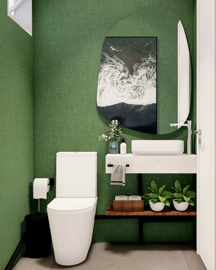 A paleta de cores e materiais foi cuidadosamente escolhida para refletir a essência do cliente. Tons amadeirados escuros e móveis em cinza escuro foram utilizados para transmitir uma atmosfera sóbria e masculina, alinhada ao perfil do cliente. Para suavizar a rigidez do ambiente, a cozinha foi projetada em tom verde e pedra branca, oferecendo um contraste delicado e trazendo um toque de frescor e leveza ao conjunto.