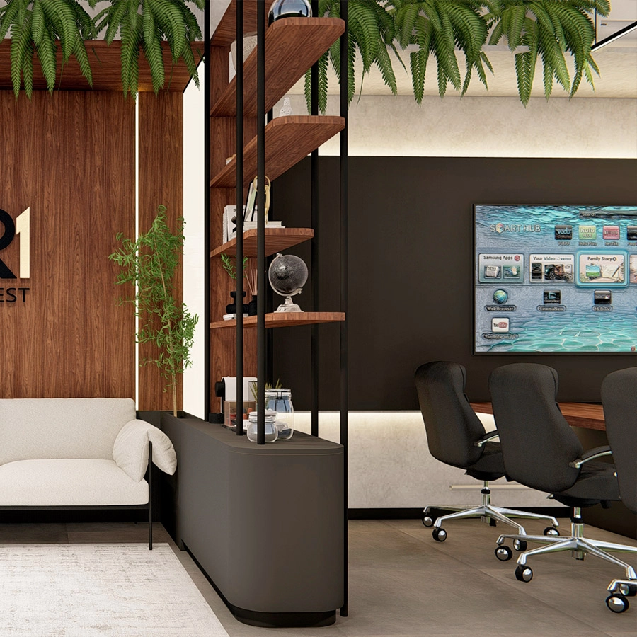 Nosso principal objetivo foi criar um espaço onde os corretores se sentissem confortáveis e estimulados a trabalhar de maneira colaborativa, mas que, ao mesmo tempo, transmitisse aos clientes uma sensação de acolhimento e bem-estar. Queríamos que todos se sentissem em casa, em um ambiente que fosse tanto funcional quanto aconchegante.