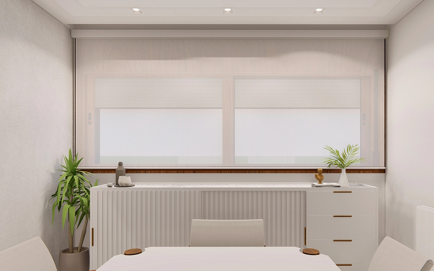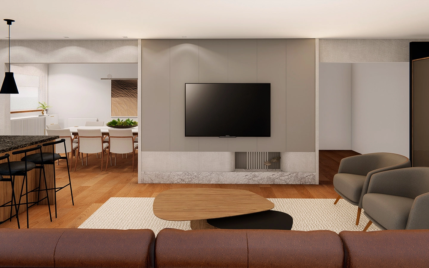 Cada tom de acabamento foi cuidadosamente escolhido para criar uma atmosfera acolhedora e sofisticada, que se mistura naturalmente com o restante da decoração já existente na casa. O painel de TV foi uma escolha estratégica. Sem a necessidade de um hack, garantimos que a área de estar se mantenha ampla e fluida.